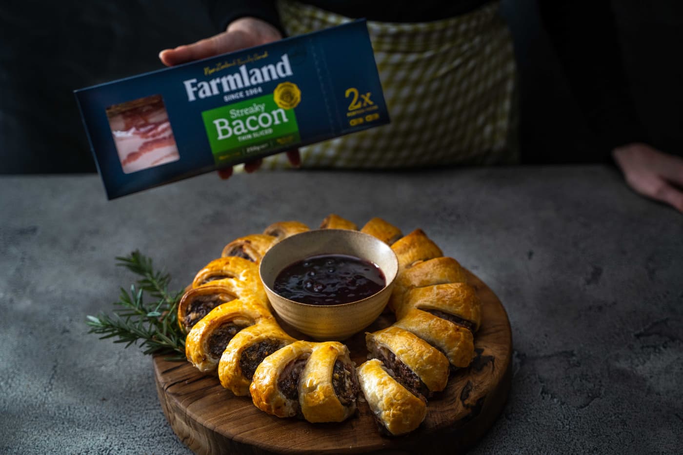 Make these decadent venison sausage rolls for your next gathering. The venison is wrapped in bacon for extra deliciousness. We dip our sausage rolls into BluesBros blueberry chutney. If you're short on time just use store brought pastry.